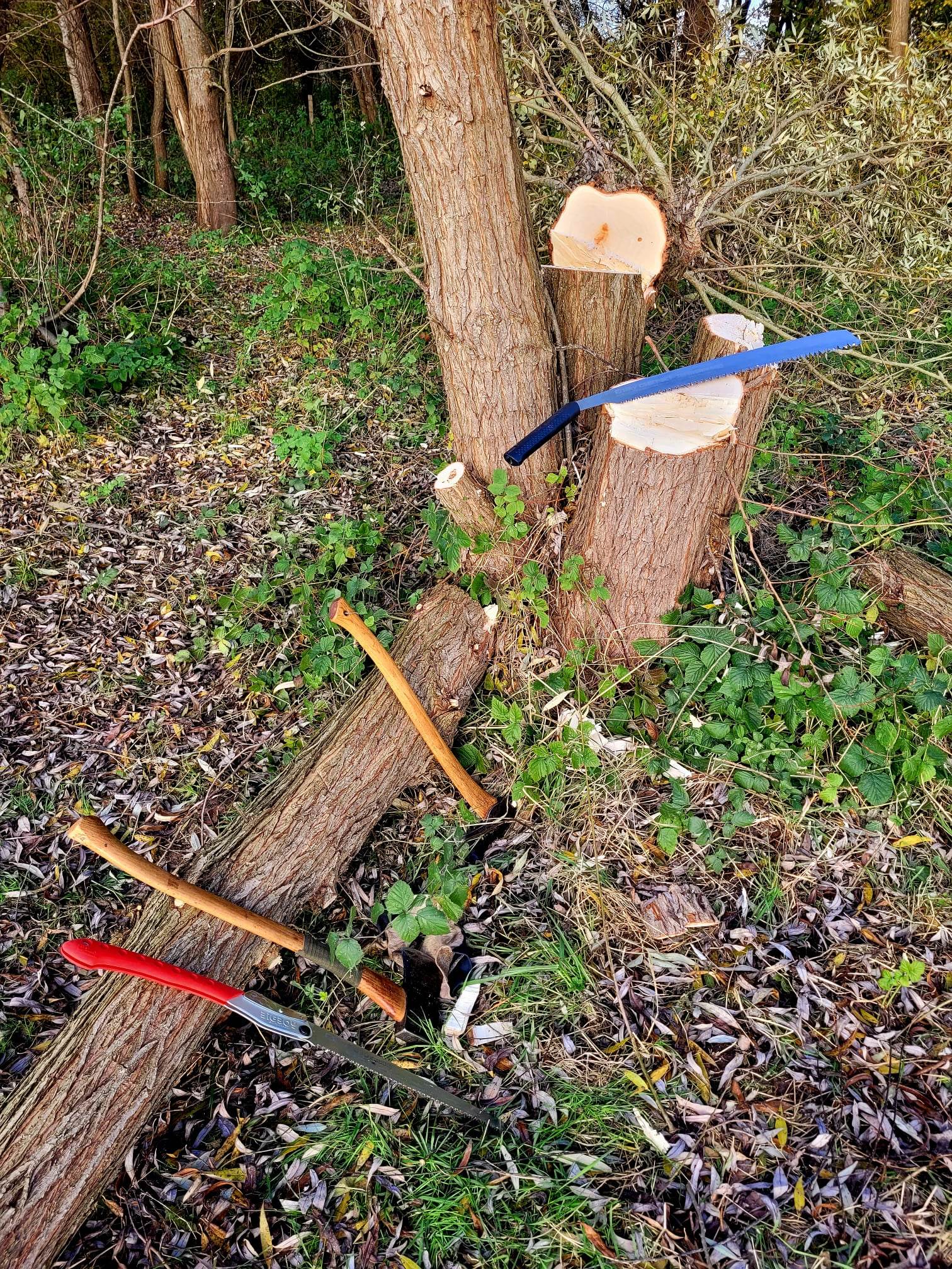 Vellen van stammen met kleinere diameter met zaag en bijl